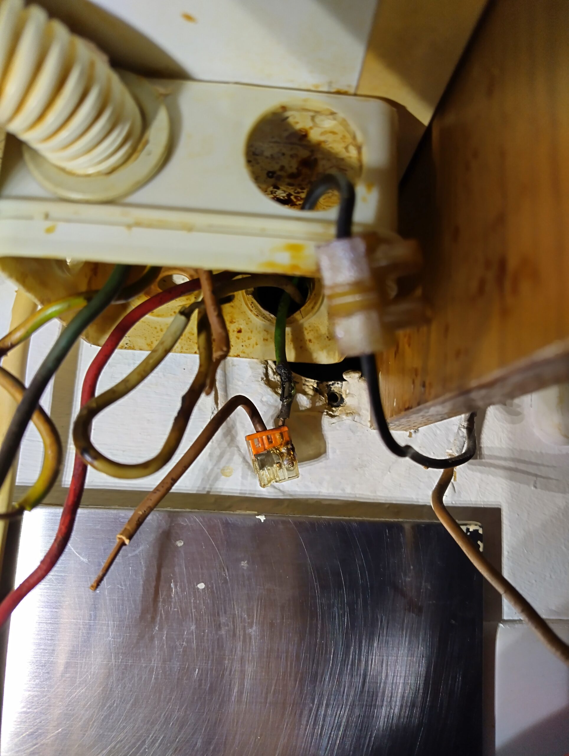 De foto links laat een ’te warm’ geworden lasdoos zien. De oorzaak daarvan is een combinatie van slechte verbinding van de bedrading en zware keuken apparatuur. Doordat [oud en nieuw] elektra draad in een niet gesloten lasdoos zit onder het keukenkastje kon daardoor het vet van jaren naar binnen dringen. Dit alles bij elkaar had ook nog vlam kunnen vatten door de hitte.