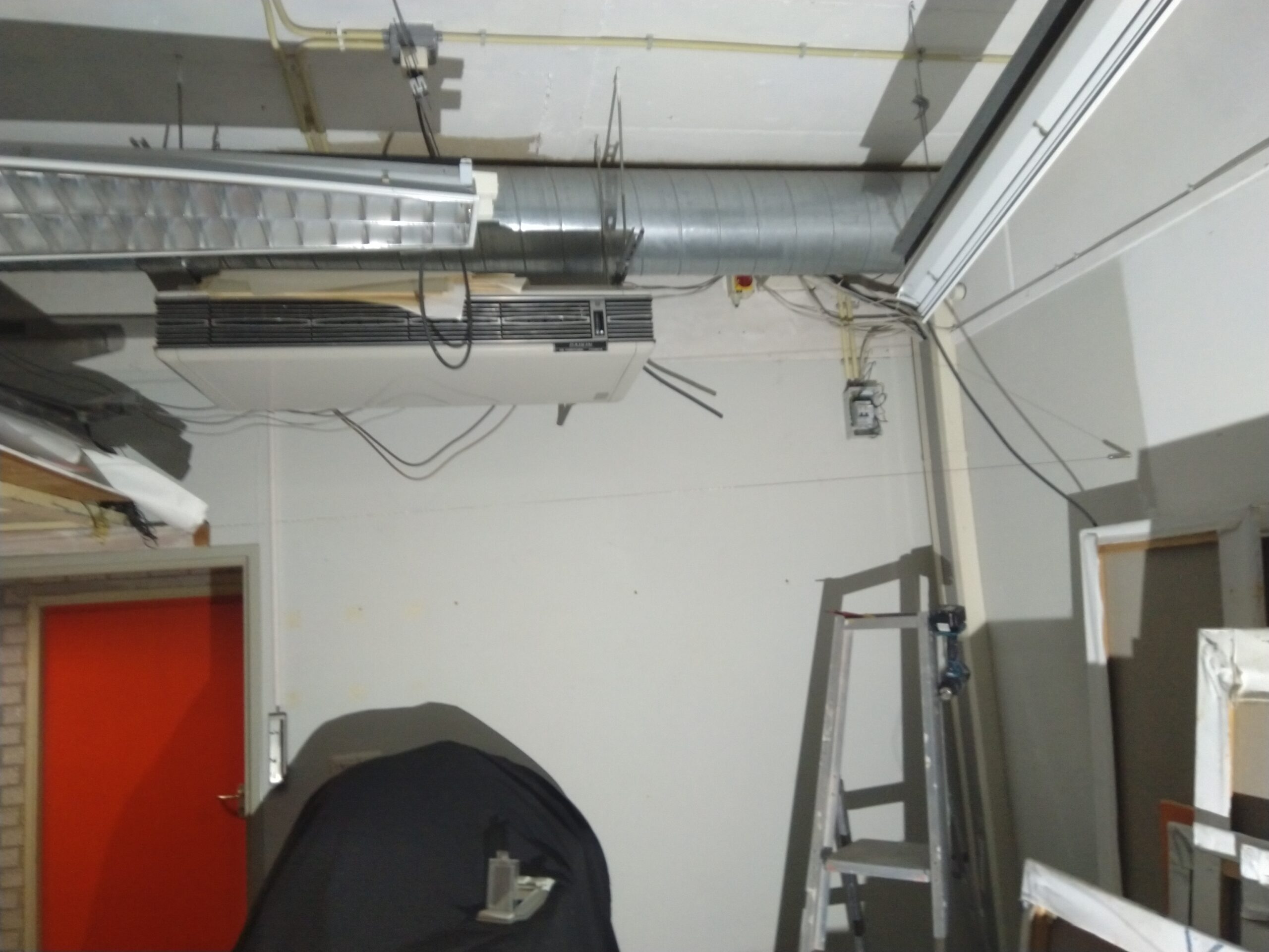 Industrieel betekent hier dat alle leidingwerk zichtbaar blijft. Het wordt niets weggewerkt onder het plafond. Later zal alles op het plafond 1 kleur krijgen. Ik mocht alleen het groepenkastje van dit atelier in Utrecht verplaatsen. Een stukje strak werk in een rommelige omgeving. Zoals eerder gezegd, geen prachtige eindresultaten voor de portfolio. Maar uiteindelijk is het geheel later toch wel mooi geworden. _______________________________________________________________________________________